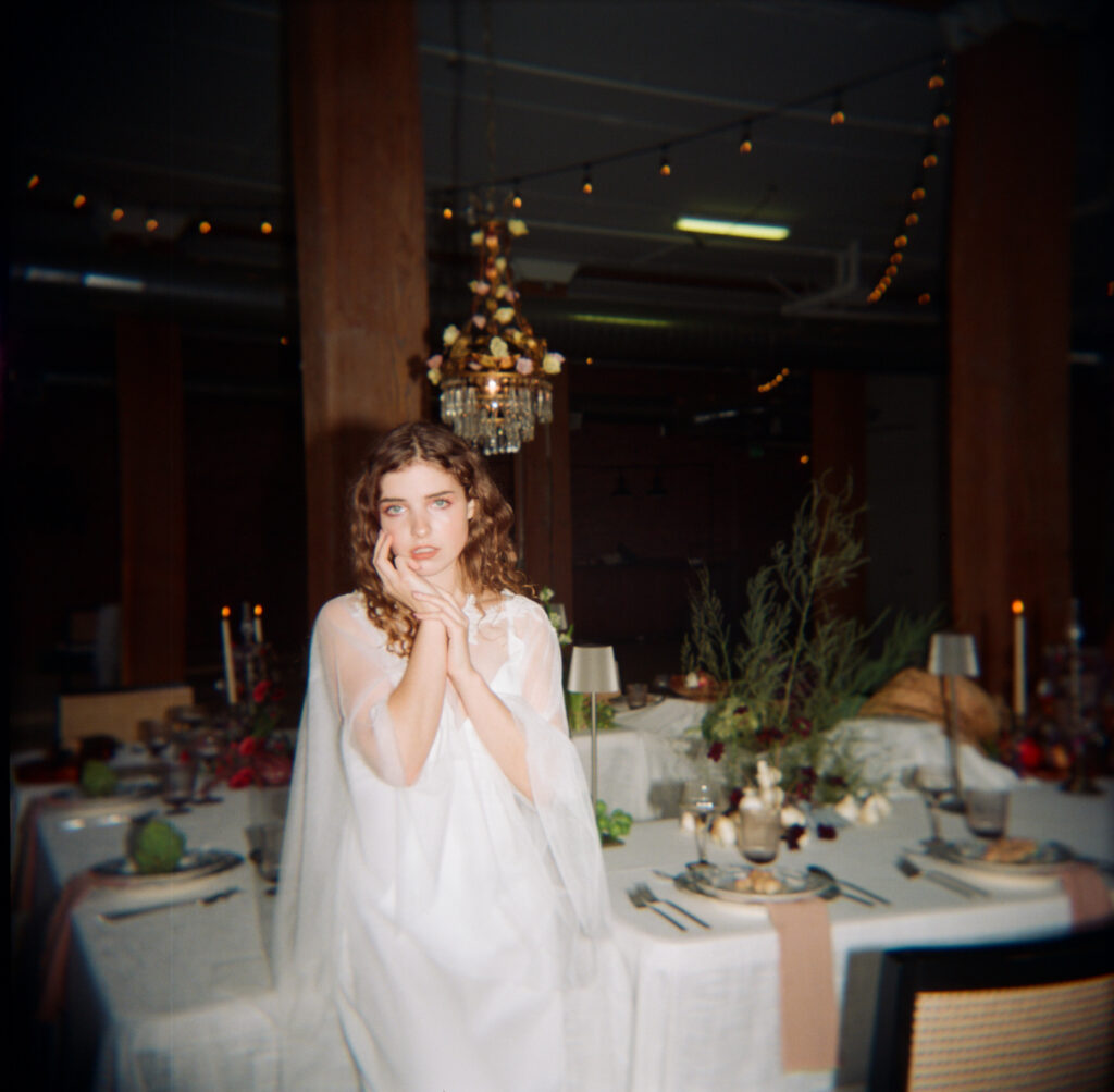 Some of the most evocative images from the Understory Styled Shoot were captured on a Holga 120 film camera — an intentional choice that embraces imperfection, light leaks, softness, and unpredictability. The Holga’s lo-fi nature contrasts beautifully with the refined editorial styling, creating imagery that feels emotional, nostalgic, and deeply artistic.